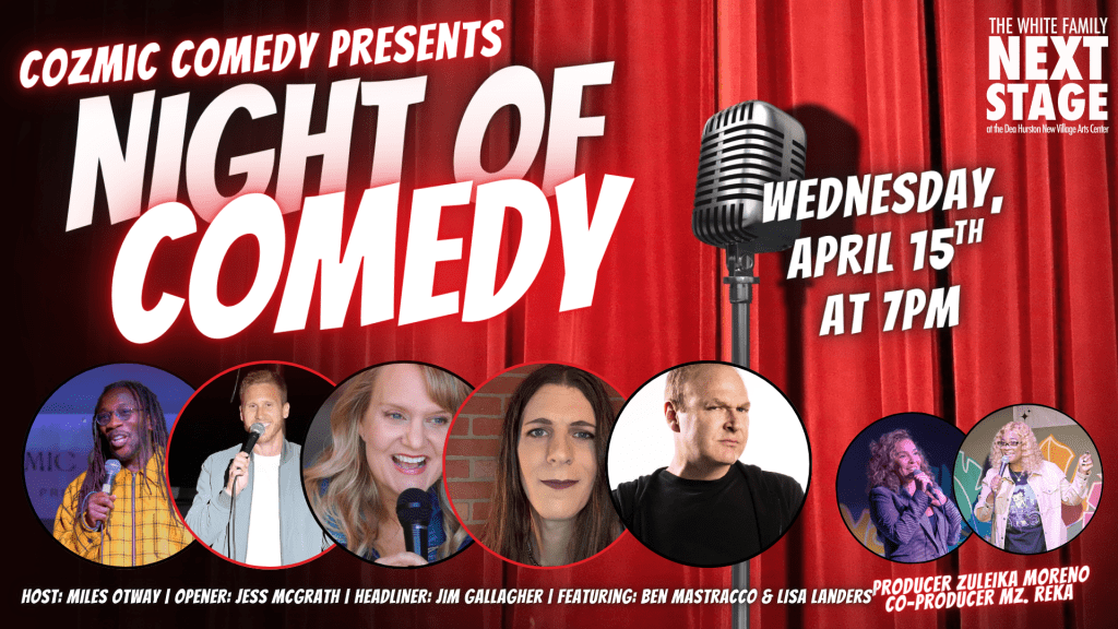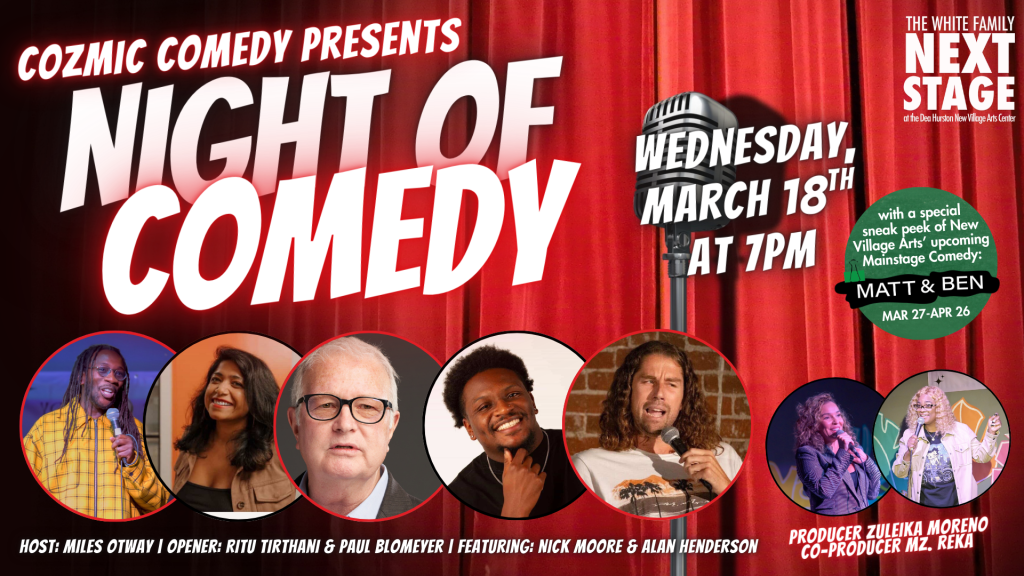 Join us for our monthly stand-up showcase at The New Village Arts Theater in Carlsbad, CA, where each event features a diverse lineup of talented comics guaranteed to make you laugh out loud.
