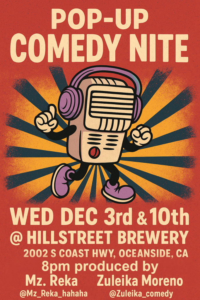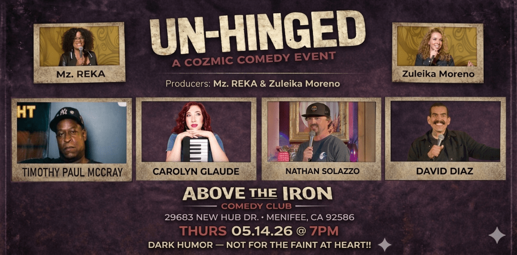 Cozmic Comedy is a Southern California stand-up comedy production bringing together some of the region’s brightest and funniest performers. Founded and produced by comediennes Mz. Reka and Zuleika Moreno, Cozmic Comedy delivers high-energy shows filled with laughter, community, and cosmic good vibes.